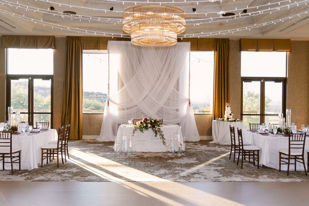 Upon entering, guests are greeted by an ambiance of luxury, with high ceilings adorned with dazzling chandeliers that cast a warm and inviting glow. The ballroom features large windows that offer breathtaking views of the lush, rolling greens of the golf course and the scenic desert landscape beyond, creating a picturesque backdrop for any event.