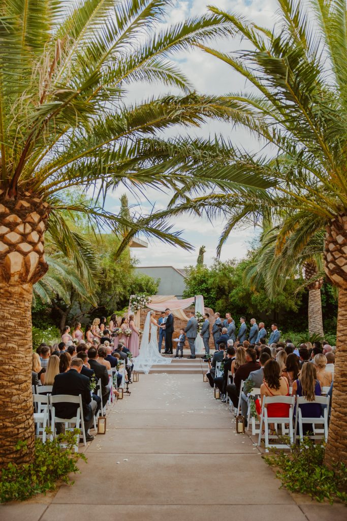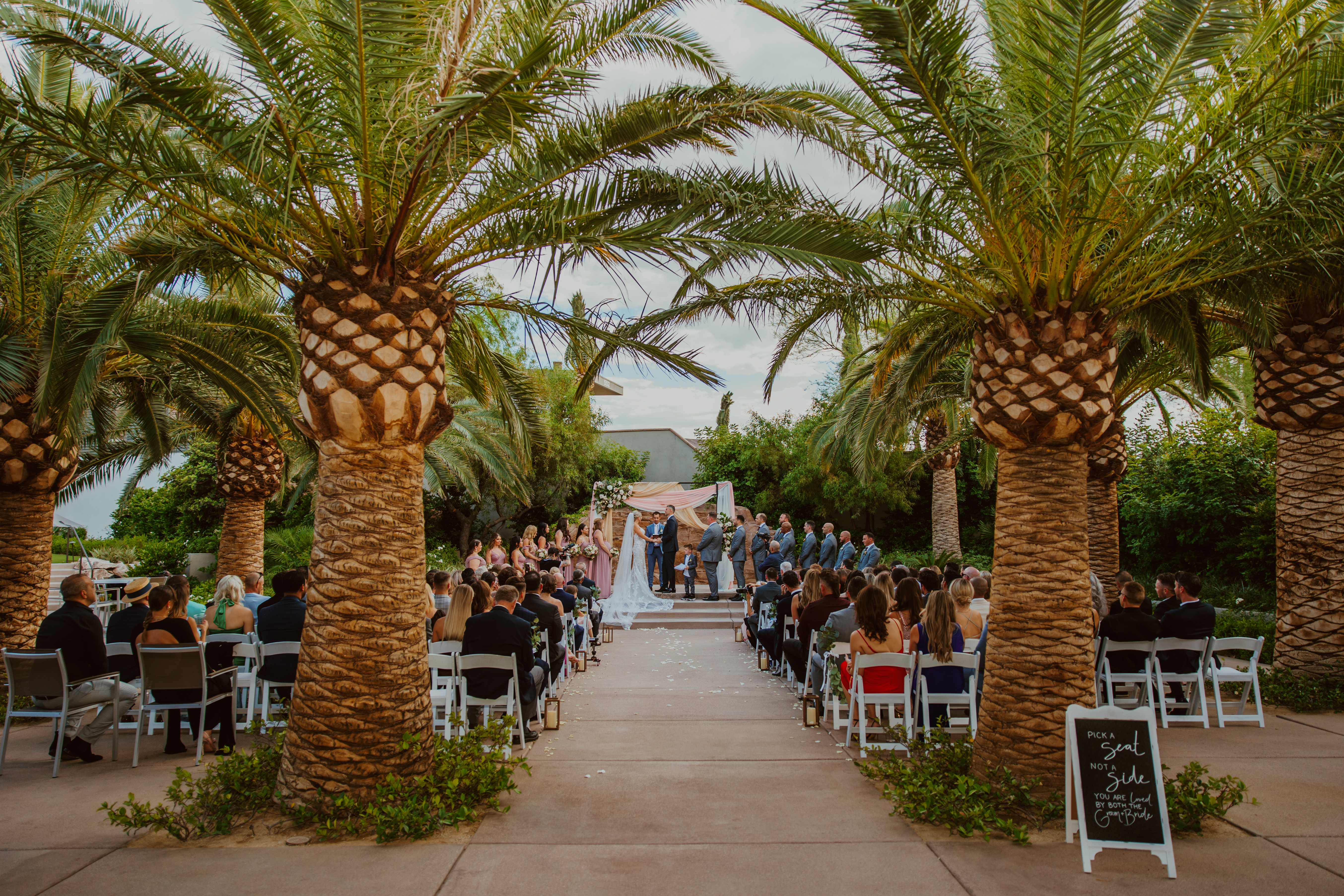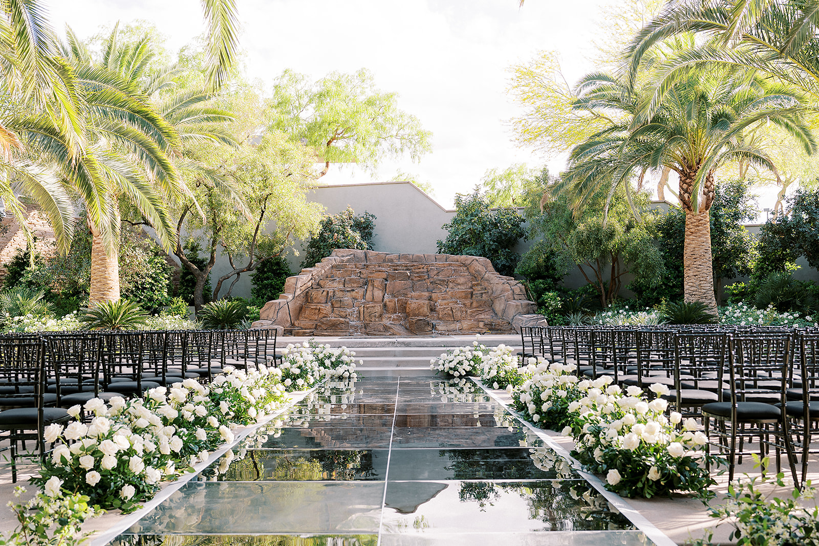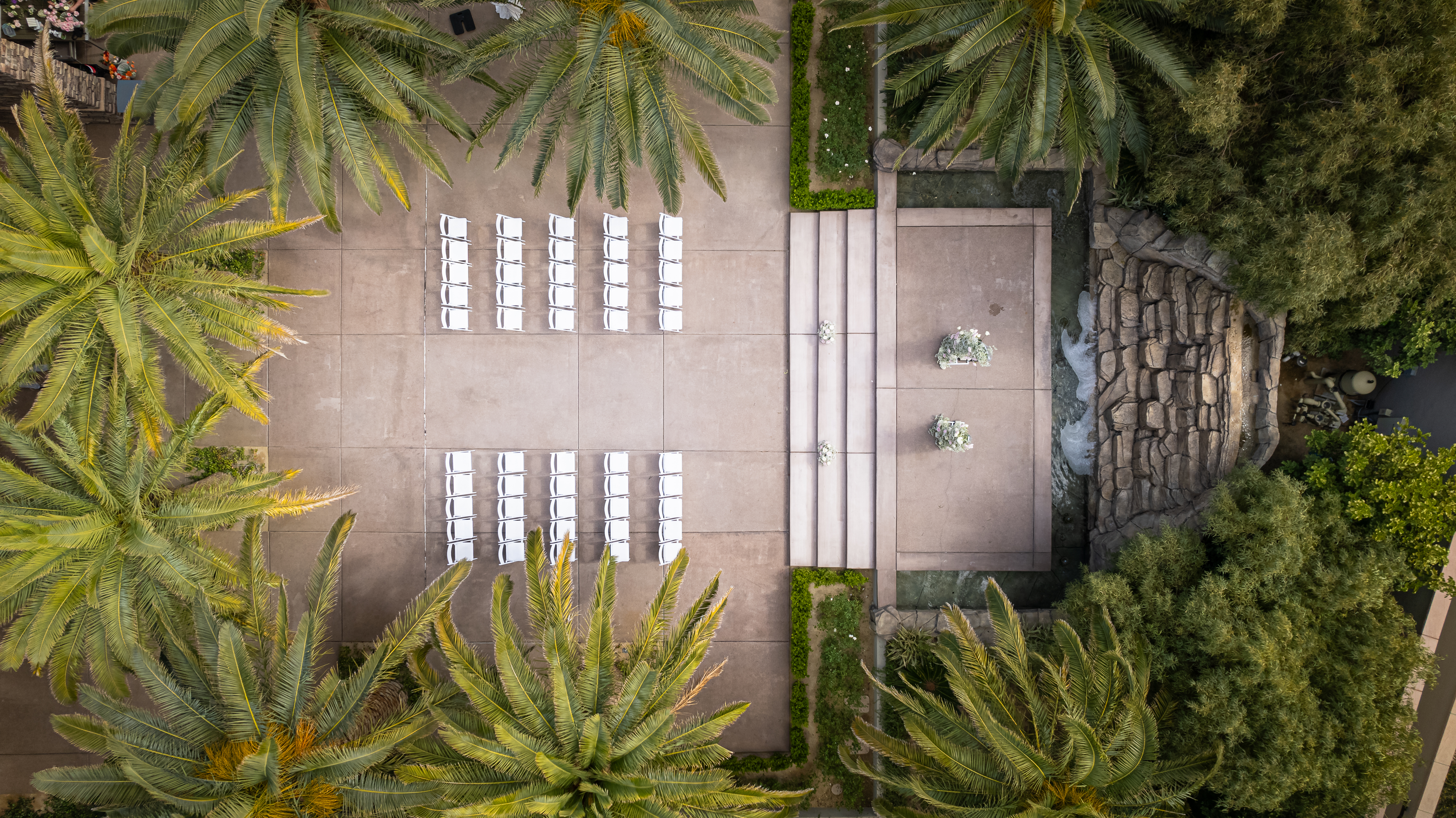 The Palm Court is one of DragonRidge’s most captivating event destinations—an elegant outdoor oasis designed for extraordinary weddings and unforgettable gatherings. Enclosed within 15,000 square feet of lush landscaping, the space welcomes up to 400 guests and is framed by towering Canary Palm trees and a dramatic rock waterfall.